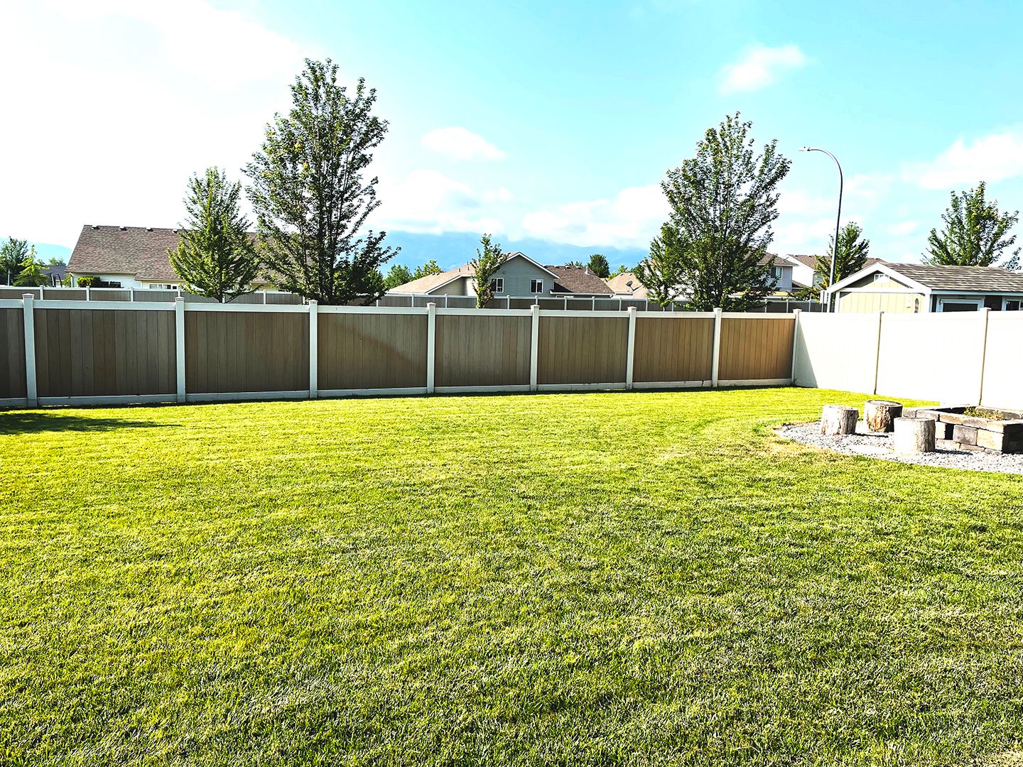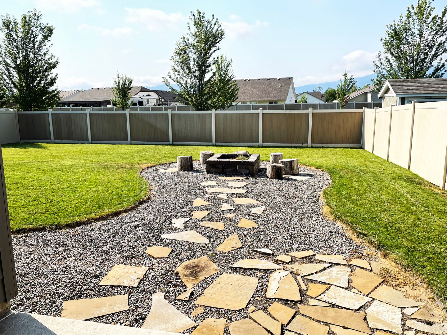 Step outside to a fully landscaped and fenced backyard with a fire pit and mountain views, perfect for relaxing or hosting gatherings. Additional features include central A/C and heat, a 2-car garage with opener, and a large fenced yard.